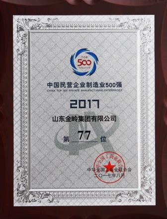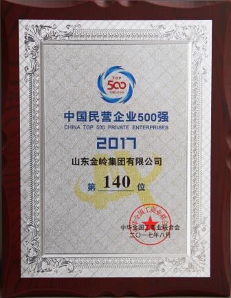 2017年8月24日,全國工商聯(lián)與山東省政府聯(lián)合舉辦的“2017年中國民營經(jīng)濟(jì)500強(qiáng)發(fā)布會暨民營經(jīng)濟(jì)發(fā)展峰會”在濟(jì)南舉行,會議發(fā)布了2017中國民營企業(yè)500強(qiáng)榜單,我公司再次入圍,位列中國民營企業(yè)500強(qiáng)第140位,中國民營企業(yè)制造業(yè)500強(qiáng)第77位。