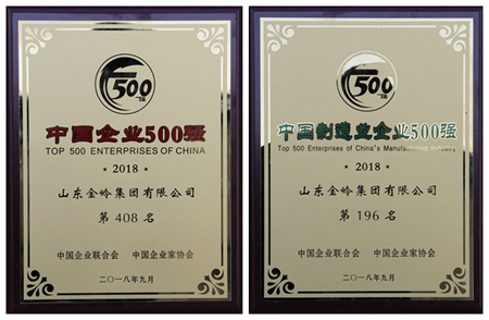 2018年9月2日,中國企業(yè)聯(lián)合會(huì)、中國企業(yè)家協(xié)會(huì)在陜西西安舉行2018中國500強(qiáng)企業(yè)高峰論壇,發(fā)布 “中國企業(yè)500強(qiáng)”榜單。金嶺集團(tuán)位列“2018中國企業(yè)500強(qiáng)”第408位,“2018中國制造業(yè)企業(yè)500強(qiáng)”第196位。