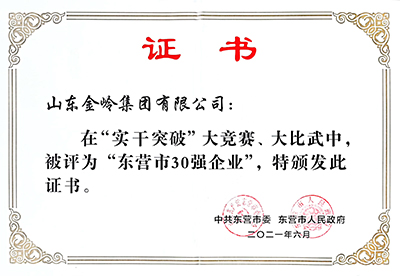 2021年6月27日,在東營市市委、市政府舉辦的“實干突破”大競賽、大比武活動中,山東金嶺集團有限公司被評為“東營市30強企業(yè)”。以表彰公司踐行新的發(fā)展理念,不斷提高創(chuàng)新能力、優(yōu)化產(chǎn)品結(jié)構(gòu)、深入發(fā)展循環(huán)經(jīng)濟、履行社會責(zé)任等方面做出的積極貢獻。