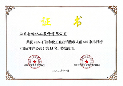 2022年11月29日,由中國(guó)石油和化學(xué)工業(yè)聯(lián)合會(huì)與化工企業(yè)管理協(xié)會(huì)主辦的中國(guó)石油和化工企業(yè)500強(qiáng)發(fā)布會(huì)以網(wǎng)絡(luò)會(huì)議形式召開。在會(huì)上,中國(guó)石化聯(lián)合會(huì)、化工企業(yè)管理協(xié)會(huì)聯(lián)合發(fā)布了“2022中國(guó)石油和化工企業(yè)銷售收入前500家”榜單,金嶺集團(tuán)位列綜合類第49位;金嶺化工股份公司位列獨(dú)立生產(chǎn)經(jīng)營(yíng)類第35位、位列“中國(guó)專用化學(xué)產(chǎn)品企業(yè)銷售收入前100家”第3位。
