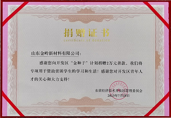 2023年7月28日,東營青年人才“背包E?!眴?dòng)儀式暨悅來湖人才街區(qū)開街活動(dòng)在開發(fā)區(qū)悅來湖人才街區(qū)舉行,山東金嶺新材料有限公司作為“金種子”贊助單位為活動(dòng)贊助資金兩萬元,東營經(jīng)濟(jì)技術(shù)開發(fā)區(qū)黨工委書記、管委會(huì)主任康茂禮為公司頒發(fā)榮譽(yù)證書,并對(duì)公司在開發(fā)區(qū)人力資源和社會(huì)保障方面做出的貢獻(xiàn)給予充分肯定。