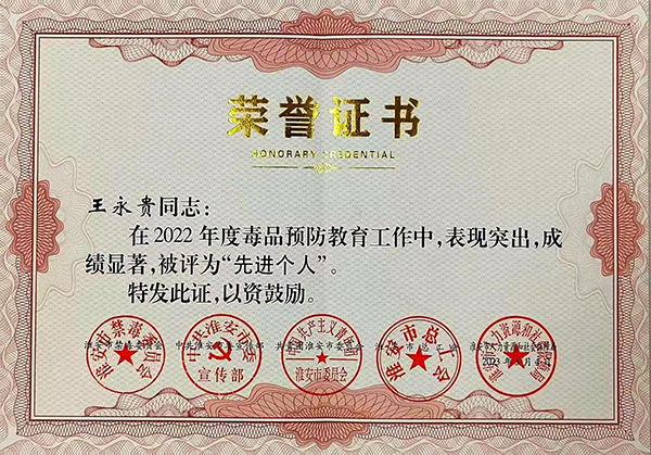 近日,集團(tuán)公司副總裁王永貴被淮安市禁毒委員會(huì)、中共淮安市委宣傳部、共青團(tuán)淮安市委、淮安市總工會(huì)、淮安市人力資源和社會(huì)保障局評(píng)為“2022年度毒品預(yù)防教育工作先進(jìn)個(gè)人”,受到通報(bào)表揚(yáng)。