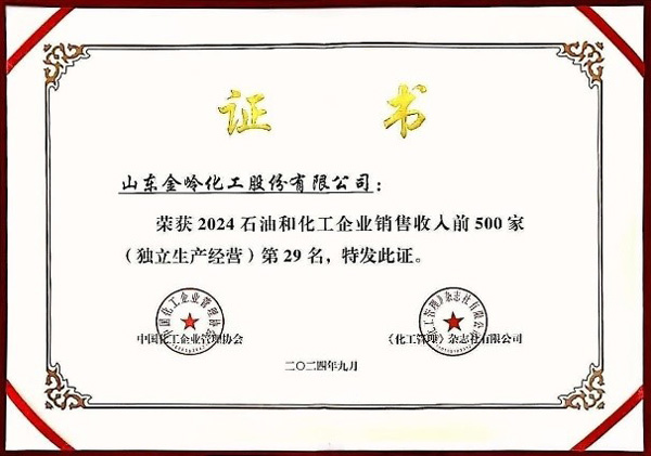金嶺集團(tuán)入圍“中國石油和化工企業(yè)銷售收入前500家”“專用化學(xué)產(chǎn)品企業(yè)銷售收入前100家”“石油和化工企業(yè)銷售收入前500家”