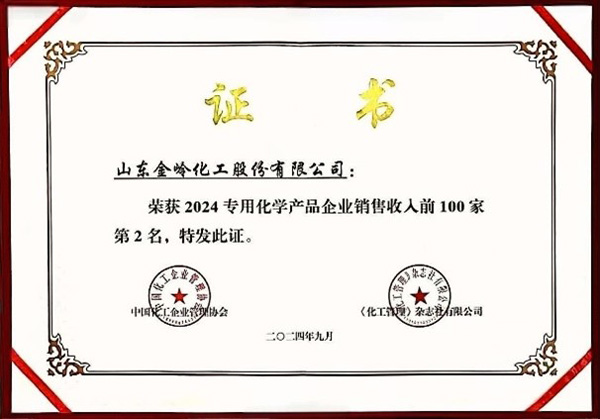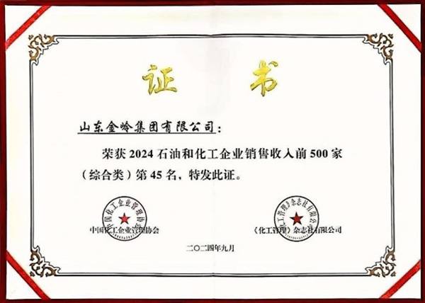 2024年9月12日,中國化工企業(yè)管理協(xié)會、東營市人民政府在東營市舉辦了“以實現(xiàn)由大到強(qiáng)的跨越”為主題的2024中國石油和化工企業(yè)銷售收入500強(qiáng)發(fā)布會,發(fā)布了2024中國石油和化工企業(yè)500強(qiáng)榜單,金嶺集團(tuán)位列“2024中國石油和化工企業(yè)銷售收入前500家”(綜合類)第45位;金嶺化工再次入圍“2024專用化學(xué)產(chǎn)品企業(yè)銷售收入前100家,位列第2位;位列“2024石油和化工企業(yè)銷售收入前500家”(獨立生產(chǎn)經(jīng)營)第29位。