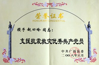 董事長趙曰嶺被授予“支援抗震救災優(yōu)秀共產(chǎn)黨員”稱號