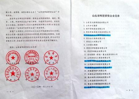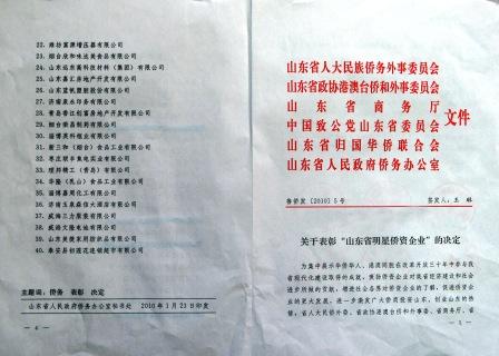 近日,我公司作為僑資企業(yè)被國務(wù)院僑務(wù)辦公室評為“全國百家明星僑資企業(yè)”,被山東省僑辦、省人大民僑外委、省商務(wù)廳、省政協(xié)港澳臺僑和外事委、省致公黨、省僑聯(lián)評為“山東省明星僑資企業(yè)”。在40家受表彰的山東省明星僑資企業(yè)中, 我公司排名第5位。